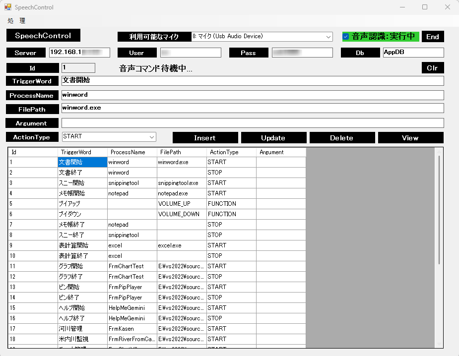 音声でアプリ起動・終了 実行画面 TriggerWord でアプリ起動・終了します。 Argument 引数を登録することで例えばプレイリストで音楽再生できます。 データベースAppDBへ登録すること ... - 監視カメラの265映像をエンコード