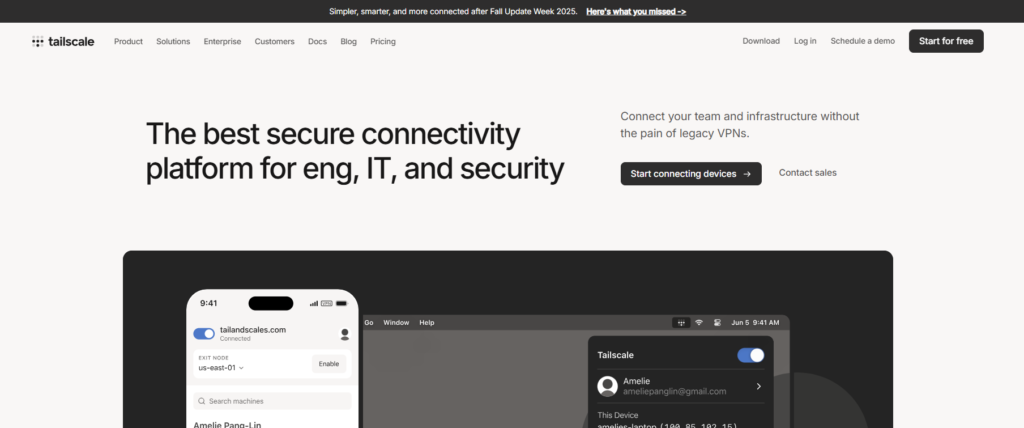Tailscale(テイルスケール)とは、設定が非常に簡単な次世代のVPN(仮想プライベートネットワーク)サービスです。従来の複雑なVPN機器の設定やネットワーク管理を不要にし、スマートフォンやPCなどのデバイス間で安全なプライベートネットワークを簡単に構築できます。