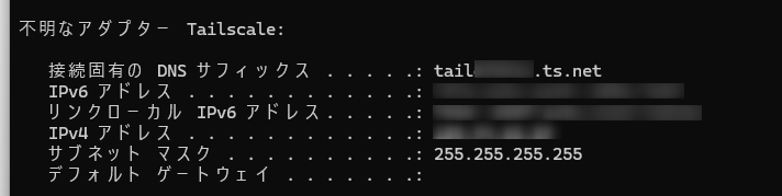 tailscaleによってVPN接続をしているデバイスには上図のように、「tailscale」という名前の仮想インタフェースがあります。 そして、このtailscaleインタフェースにユーザーアカウントに紐づいたtailnet用のIPアドレスが割り振られていることが確認できます。