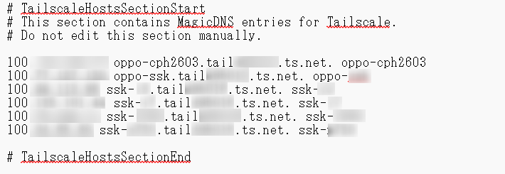 Windowsでは、C:/Windows/System32/drivers/etc/hostsにフィルタ設定があります。 # TailscaleHostSectionStartというコメント行以降の部分です。