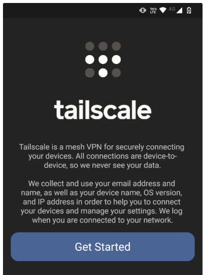 tailscaleをインストールできたら、アイコンをタップして起動します。すると、次のようにtailscaleサービスを開始するボタンGet Started が表示されるのでこれを押します。