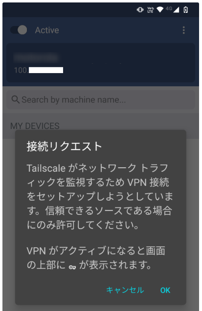 tailscaleのダッシュボードが表示され、VPN接続をリクエストするか聞かれますので、問題なければOKを押します。