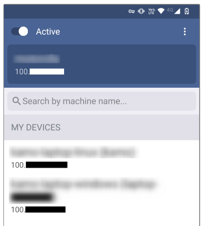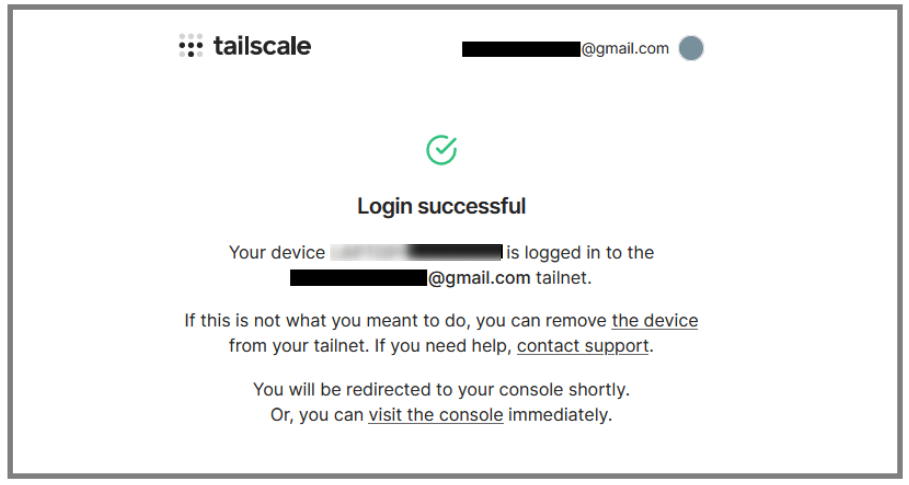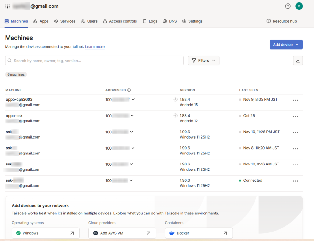 するとVPN接続が成功し、デバイス名としてWindowsのPC名(OSホスト名)がtailscaleのユーザーアカウントに紐づいたtailnetに登録されます。