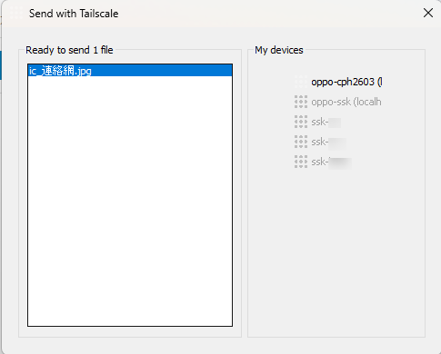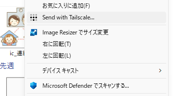 Tailscaleを接続した状態で、ファイルを右クリックしたり、スマートフォンでは共有の項目を見ると、Send with Tailscaleという項目があります。