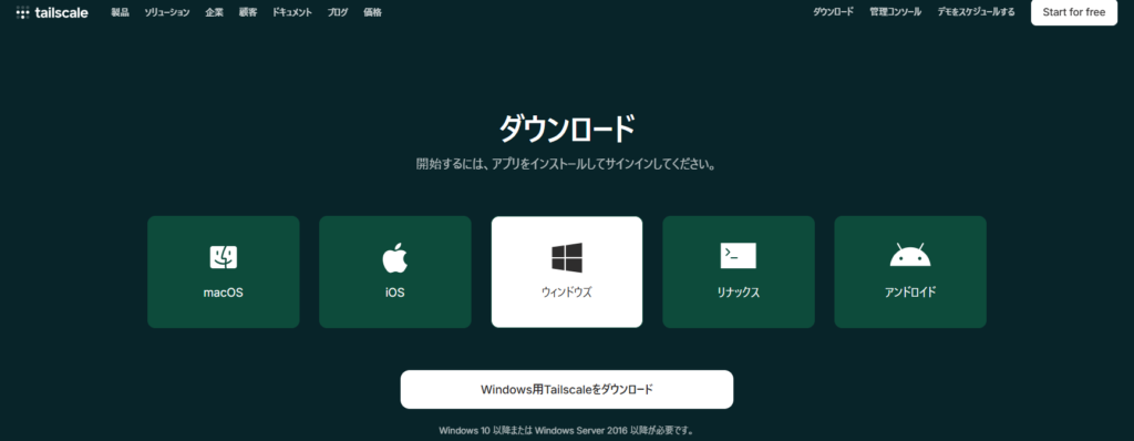 Windowsのクライアント用tailscaleアプリは以下の公式サイトのダウンロードページから入手できます。