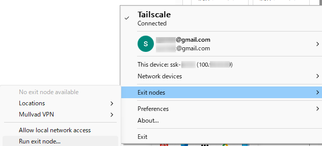 Exit nodeを有効にするには、有効にしたいマシンのTailscaleのメニューからExit nodeのメニューを開いてRun exit nodeを有効にします。