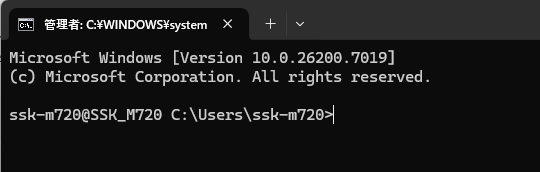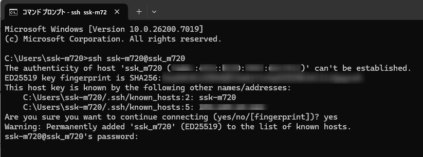 コマンドプロンプト画面より ssh ユーザー名@ホスト名(あるいは、tailscaleのIPアドレス) で接続します。
