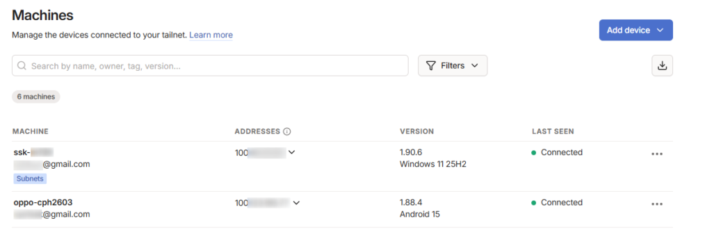 「Subnet Routers」機能を有効化した端末名の下に「Subnets」という文字が表示されていることを確認してください。