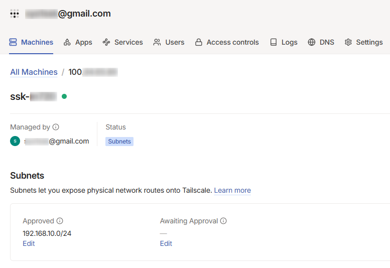「Subnet Routers」機能を有効化した端末名をクリックすると、端末単位の設定画面が表示されます。