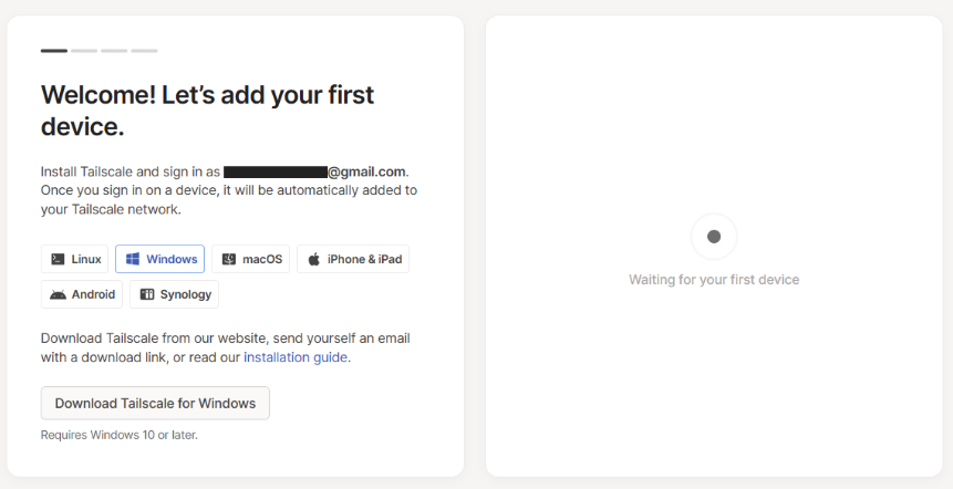 ログインが成功すると、次のユーザー管理画面に遷移します。 初回ログイン時はVPN接続登録をしたデバイスは存在しません。そのため、右側にWaiting for your first deviceというメッセージが表示されます。 またこの時に、左側に各デバイスのクライアント用tailscaleアプリのインストール案内も表示されます。
