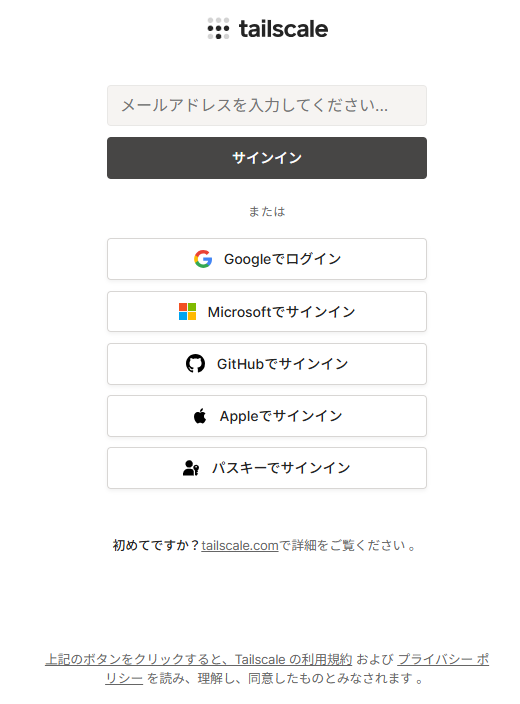 GoogleやMicrosoftアカウントによるログイン認証の選択画面が表示されます。予め利用しているサービスのアカウントをクリックしてtailscaleにログインしてください。