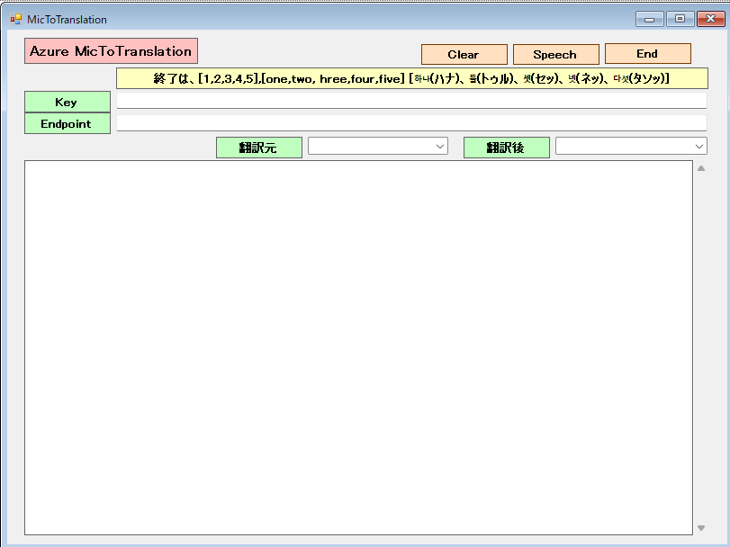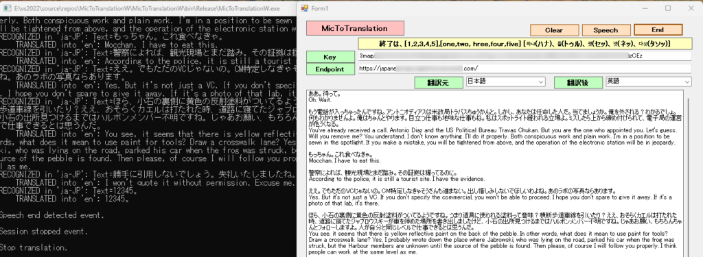 TVの音声をマイクで拾いながら実行。テレビドラマは、日本語で英語に翻訳されました。終了は、一時停止して無音のタイミングで”12345”と発声すると終了し、テキストボックスに翻訳元と翻訳後が表示されます。アプリの実行フォルダーにテキストデータ(ファイル名は、TEXT。内容は、追記されます。)が作成されます。韓国語の翻訳終了は、”ハナ トゥル セッ ネッ タソッ"、英語は"one two three four five" です。