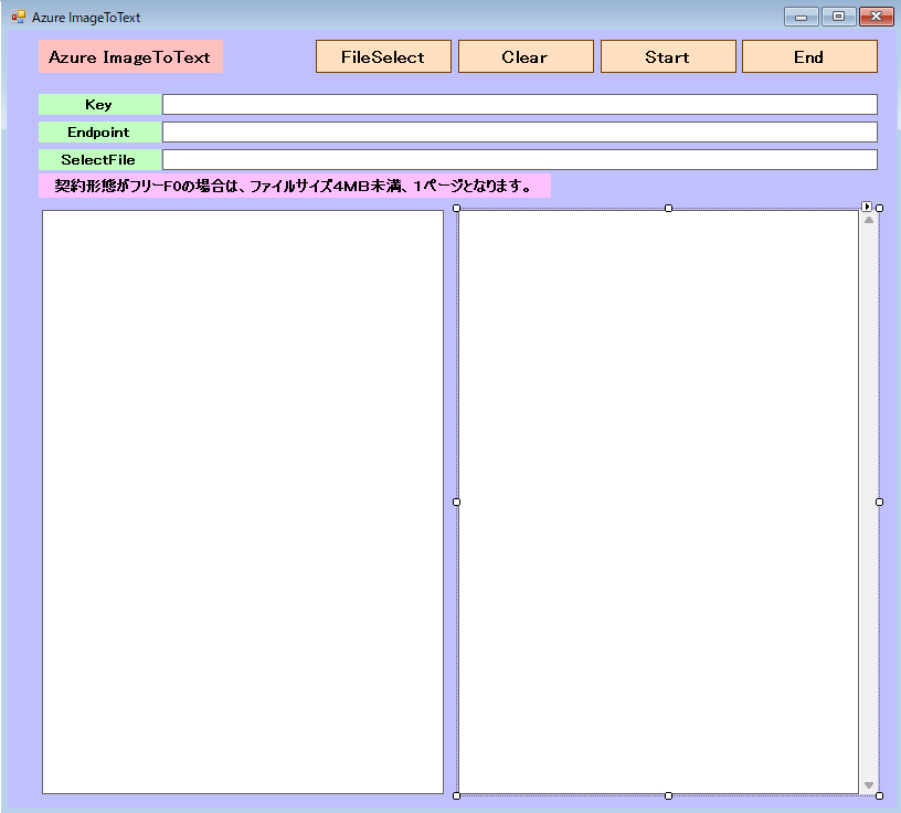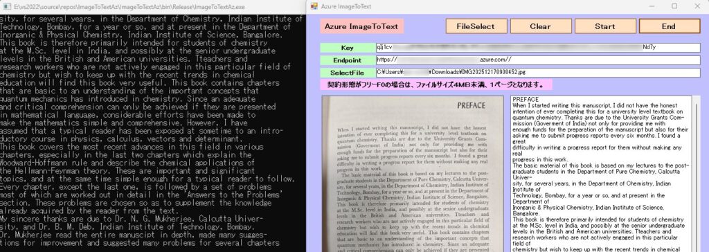 画像ファイルを Azure Document Intelligence を利用してテキストを抽出しました。OCR処理後、テキストボックスに表示されます。アプリの実行フォルダーにテキストデータ(ファイル名は、TEXT.txt )が作成されます。契約形態がフリー(F0)の場合は、ファイルサイズ4MB未満、1枚のみです。
