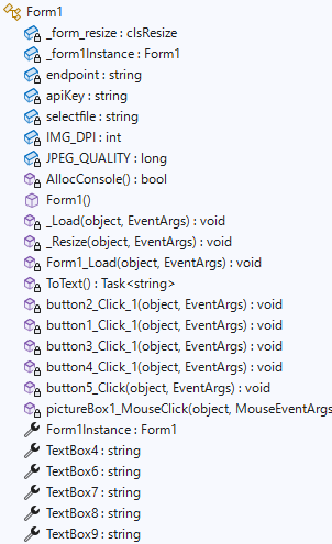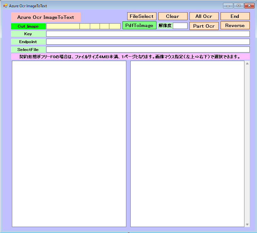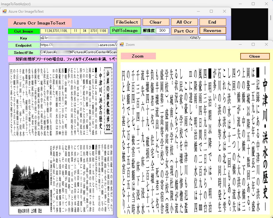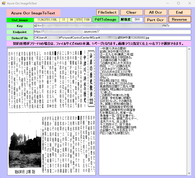 Azure Document Intelligence を利用したOCRソフト。基本は、画像ファイルを処理します。PDFファイルを利用した場合は、[ PdfToImage ] クリックでいったんPDFからJPEGへ変換してから、JPEGファイルを選択します。契約形態がフリー(F0)の場合は、ファイルサイズ4MB未満、1枚のみです。4MB以上の場合は、画像の選択範囲を設定して部分的にOCR処理します。日本語の縦書き文章は、何故か左から右に処理するので認識後、行を逆順に並び替えることができます。部分的にOCR処理ができるので細かく認識できます。[ Cut_Image ]をクリックすると選択範囲をZOOMします。この範囲を [ Part Ocr ] で認識します。[ Reverse ]をクリックすると逆順になります。