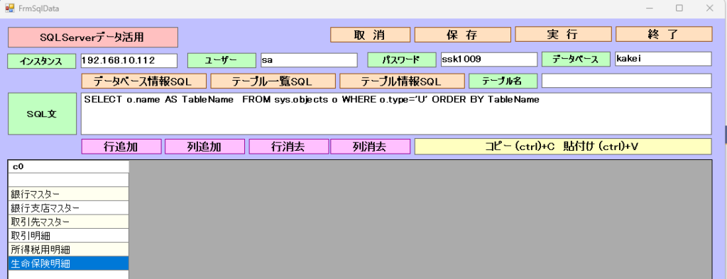 9.[テーブル一覧SQL]ボタンでテーブル一覧取得SQLを入力