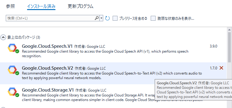 • Visual StudioのNuGetパッケージマネージャーで Google.Cloud.Speech.V1 パッケージをインストールします。