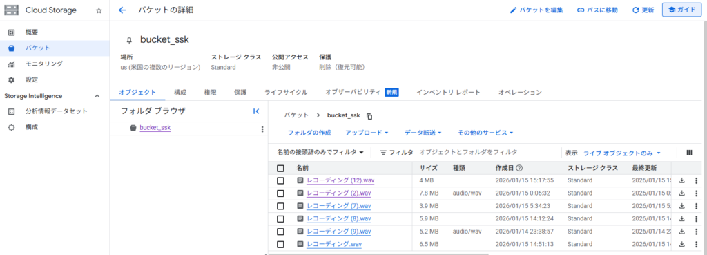 アドレスは、 gs://bucket_ssk/レコーディング (3).wav となります。